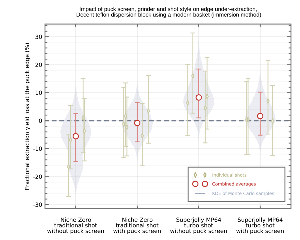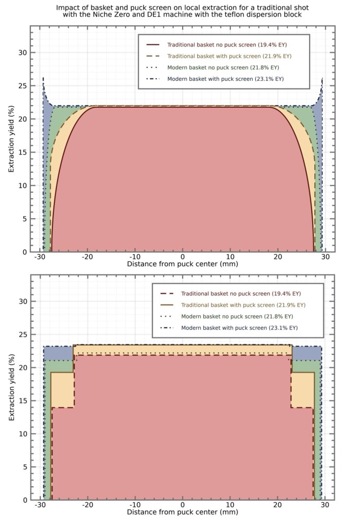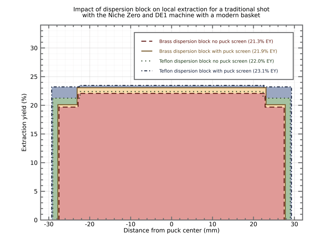 If you’re like me, you will have spent a ton of time looking at those plots and marveled at how tiny changes in design can result in incremental changes that allow for more efficient extraction. This isn’t me saying go rig your system with Decent’s (read Ben Champion’s) new dispersion, but rather that we haven’t paid enough attention historically to water flow evenness, and that there’s no one single trick that will solve issues with extraction (although a thick puck screen seems to be a good start).